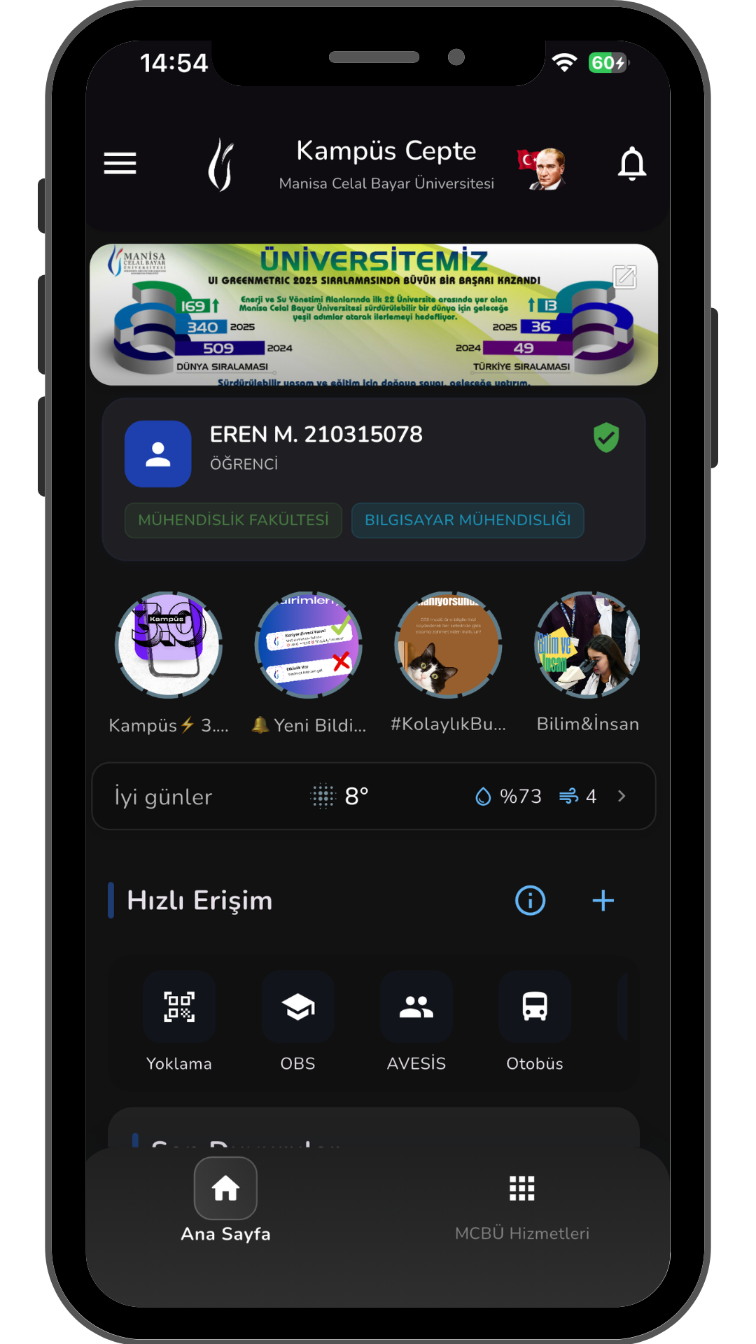 Üniversite deneyiminizi dijitalleştiriyoruz. MCBÜ Kampüs; akademik verilerden sosyal yaşama kadar ihtiyacınız olan tüm bilgilere ve araçlara tek ekrandan ulaşmanızı sağlayarak, kampüs hayatınıza hız, güven ve teknoloji katar.